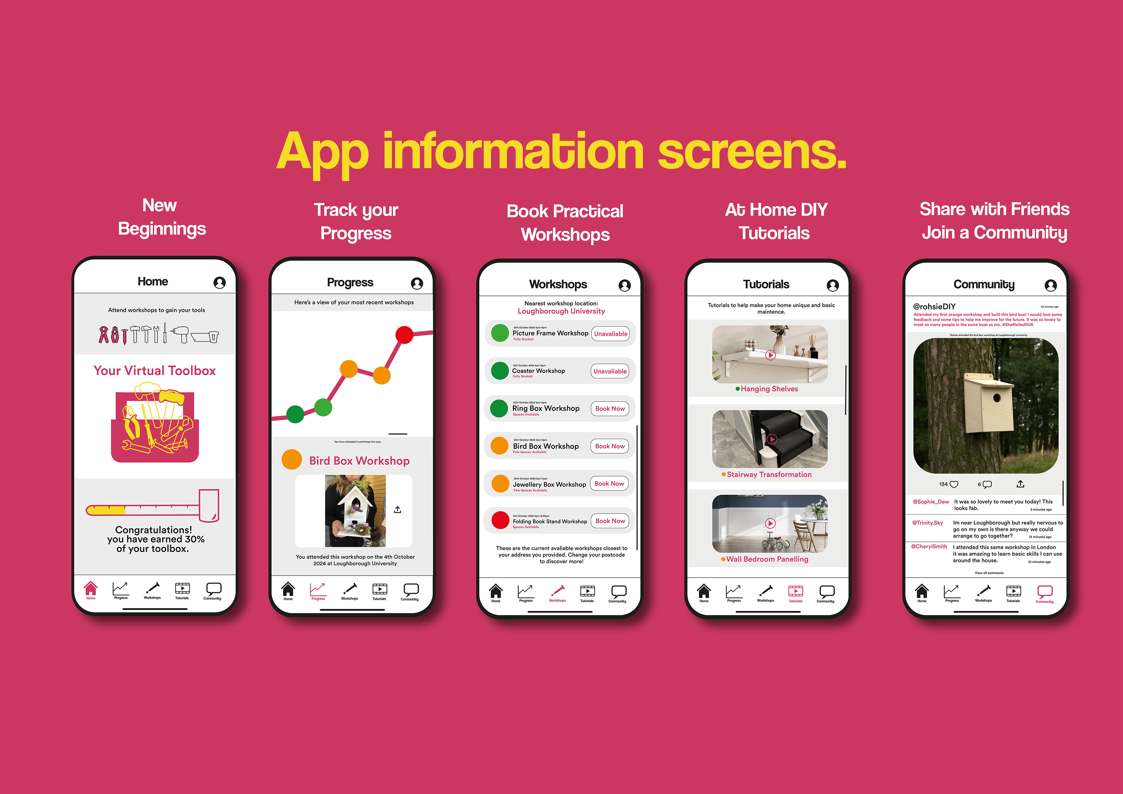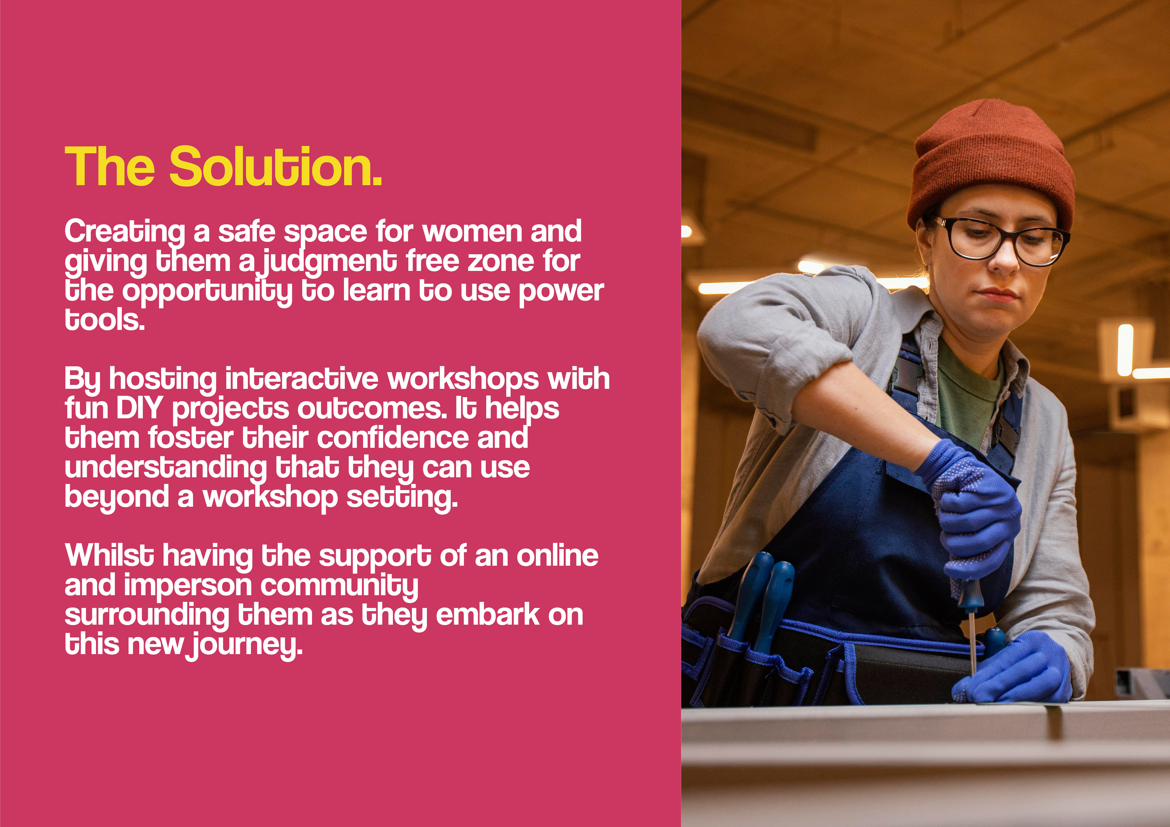 This university project concept creates a safe, judgment-free space where women can learn to use power tools with confidence. Through interactive workshops and fun DIY projects, participants gain practical skills they can apply beyond the sessions. Supported by both in-person and online communities, the initiative empowers women to explore new abilities in a welcoming and encouraging environment.