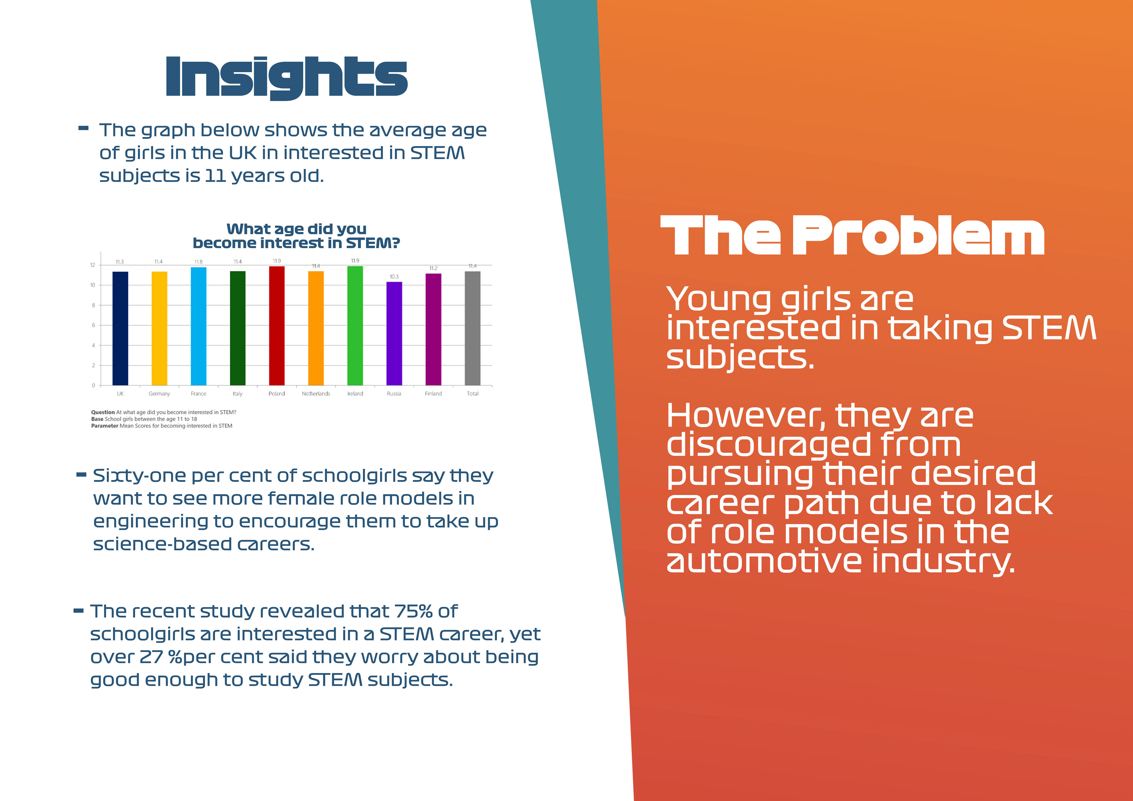 This university project concept tackles the gender gap in the automotive industry by encouraging young girls to pursue STEM careers. It creates inclusive learning opportunities and connects students with experienced women in the field, providing role models, mentorship, and real-world insight. The goal is to build confidence, challenge stereotypes, and inspire more girls to see a future for themselves in automotive STEM.
